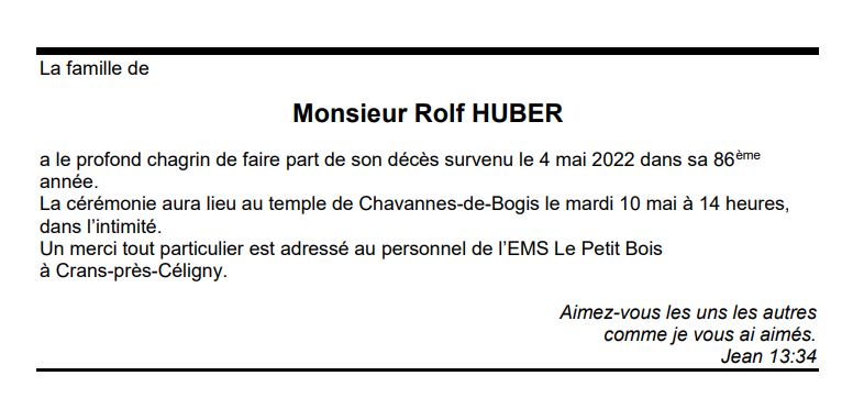 Monsieur Rolf HUBER 14 aoû. 1936 - 04 mai. 2022 Avis mortuaire PFG Télecharger PDF Partager sur: Galerie PreviousNext PreviousNext