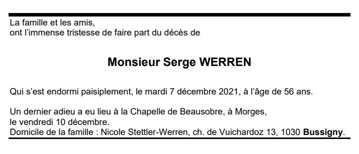 Monsieur Serge WERREN 09 avr. 1965 - 07 déc. 2021 Avis mortuaire PFG Télecharger PDF Partager sur: Galerie PreviousNext PreviousNext