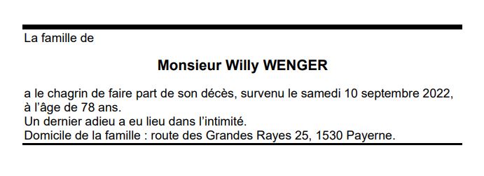 Monsieur Willy WENGER 28 mar. 1944 - 10 sep. 2022 Avis mortuaire PFG Télecharger PDF Partager sur: Galerie PreviousNext PreviousNext