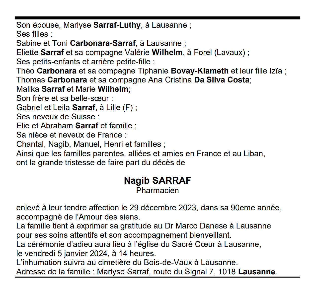 Nagib SARRAF Pharmacien 05 mar. 1934 - 29 déc. 2023 Avis mortuaire PFG Télecharger PDF Partager sur: Galerie PreviousNext PreviousNext