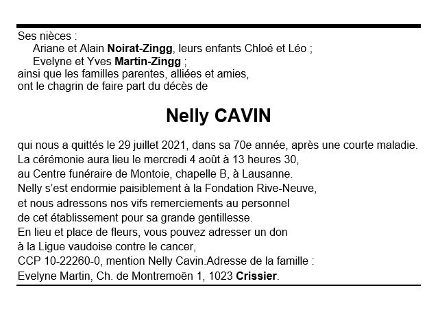 Nelly CAVIN 15 mai. 1951 - 29 juil. 2021 Avis mortuaire PFG Télecharger PDF Partager sur: Galerie PreviousNext PreviousNext
