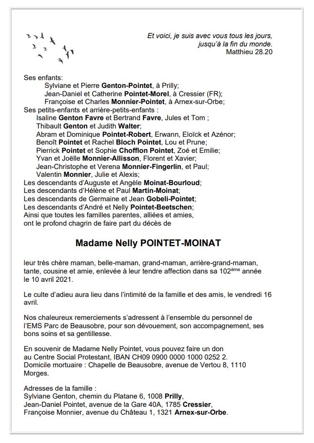 Nelly POINTET-MOINAT 06 oct. 1919 - 10 avr. 2021 Avis mortuaire PFG Télecharger PDF Partager sur: Galerie PreviousNext PreviousNext