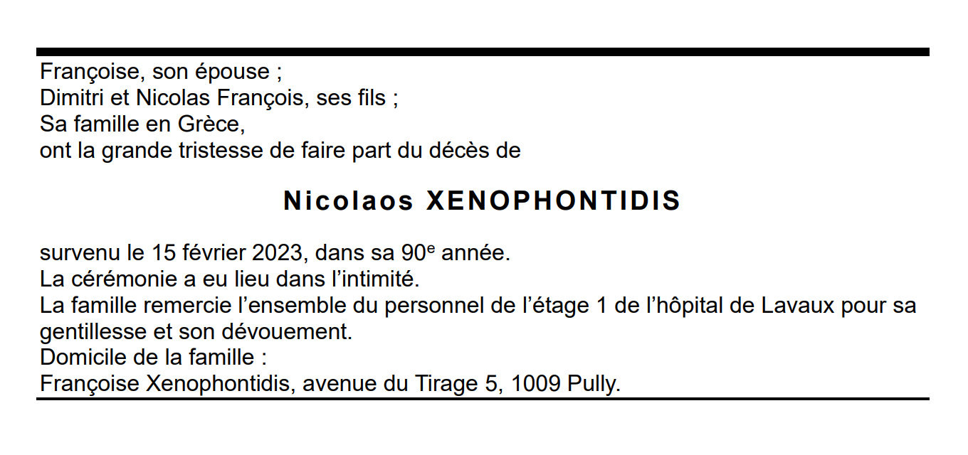 Nicolaos XENOPHONTIDIS 27 oct. 1933 - 15 fév. 2023 Avis mortuaire PFG Télecharger PDF Partager sur: Galerie PreviousNext PreviousNext