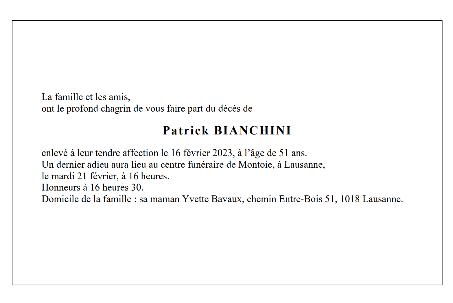 Patrick BIANCHINI 11 jan. 1972 - 16 fév. 2023 Avis mortuaire PFG Télecharger PDF Partager sur: Galerie PreviousNext PreviousNext