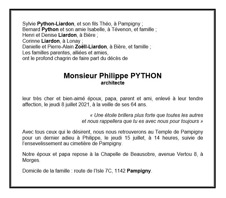 Philippe PYTHON 12 juil. 1957 - 08 juil. 2021 Avis mortuaire PFG Télecharger PDF Partager sur: Galerie PreviousNext PreviousNext