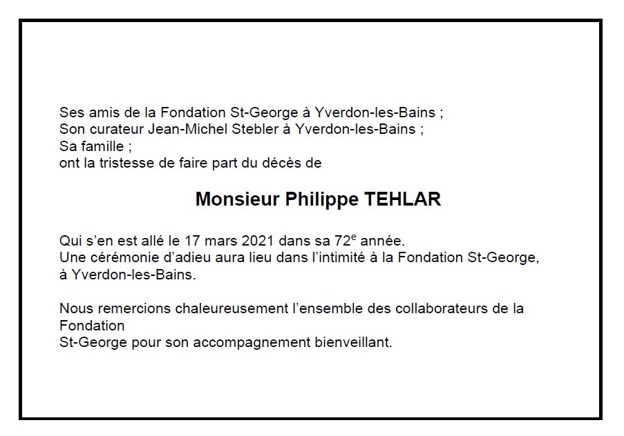 Philippe TEHLAR 26 sep. 1949 - 17 mar. 2021 Avis mortuaire PFG Télecharger PDF Partager sur: Galerie PreviousNext PreviousNext