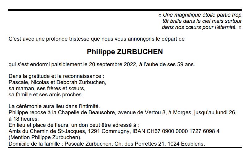 Philippe ZURBUCHEN 13 nov. 1963 - 20 sep. 2022 Avis mortuaire PFG Télecharger PDF Partager sur: Galerie PreviousNext PreviousNext