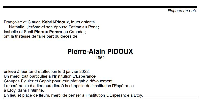 Pierre-Alain PIDOUX 12 juin. 1962 - 03 jan. 2022 Avis mortuaire PFG Télecharger PDF Partager sur: Galerie