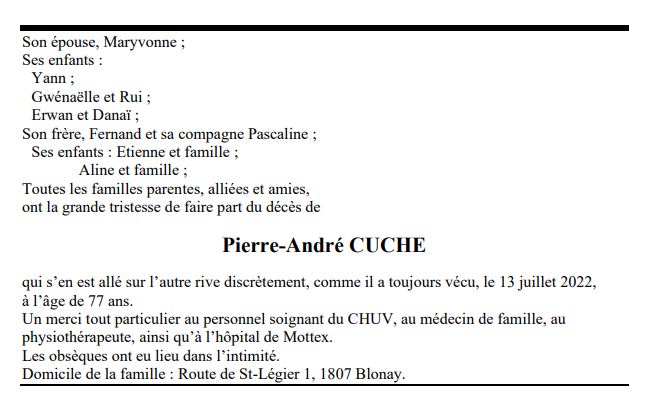 Pierre-André CUCHE 21 déc. 1944 - 13 juil. 2022 Avis mortuaire PFG Télecharger PDF Partager sur: Galerie PreviousNext PreviousNext