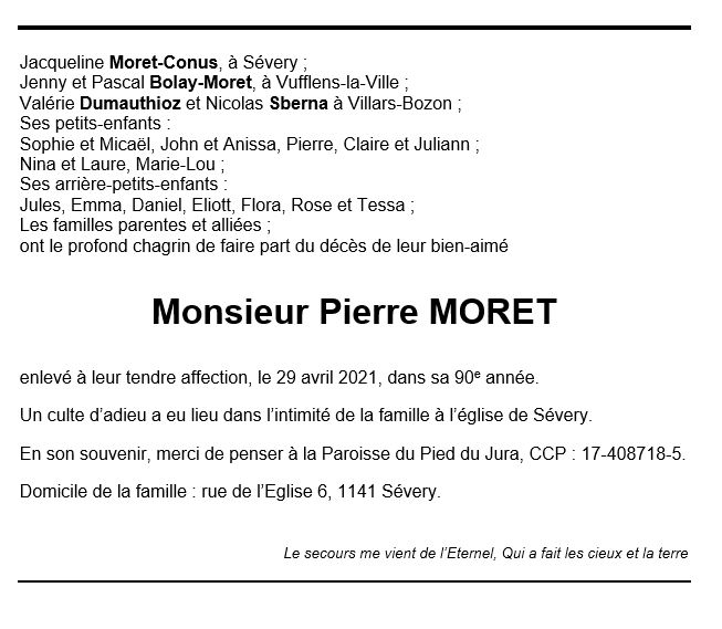 Pierre MORET 30 aoû. 1931 - 29 avr. 2021 Avis mortuaire PFG Télecharger PDF Partager sur: Galerie PreviousNext PreviousNext