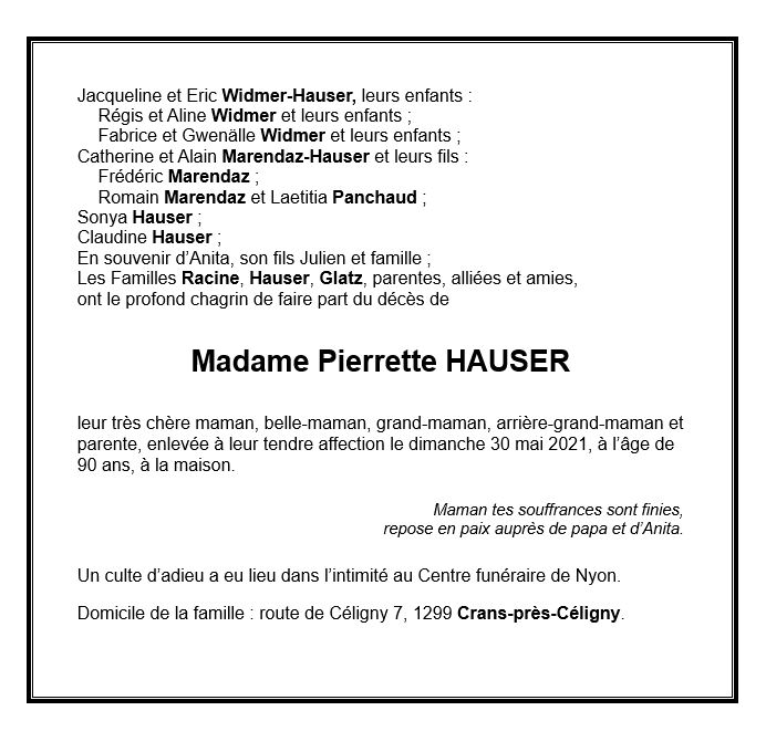 Pierrette HAUSER 10 fév. 1931 - 30 mai. 2021 Avis mortuaire PFG Télecharger PDF Partager sur: Galerie PreviousNext PreviousNext