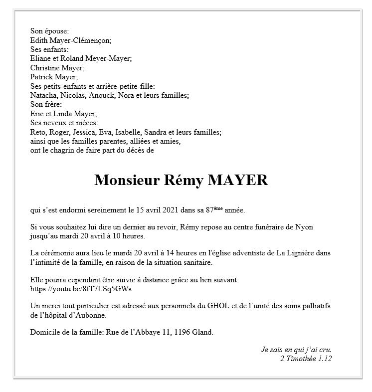 Rémy MAYER 27 mai. 1934 - 15 avr. 2021 Avis mortuaire PFG Télecharger PDF Partager sur: Galerie PreviousNext PreviousNext
