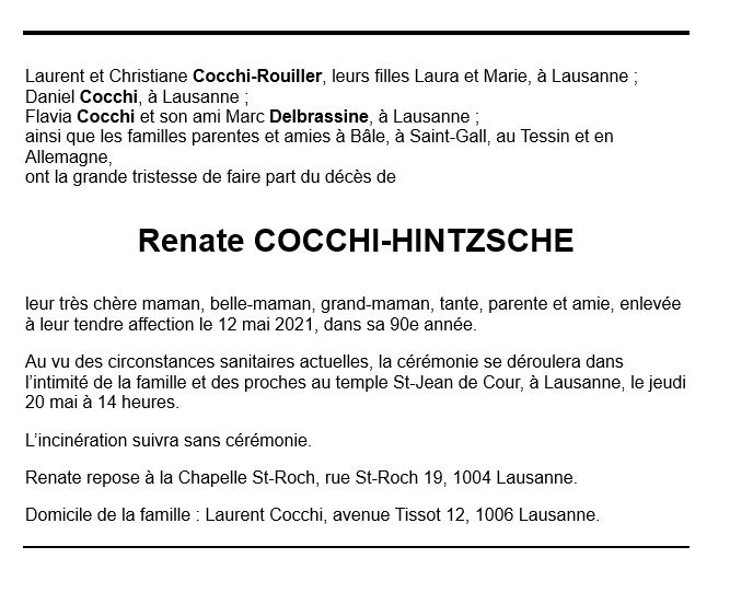 Renate COCCHI-HINTZSCHE 13 jan. 1932 - 12 mai. 2021 Avis mortuaire PFG Télecharger PDF Partager sur: Galerie PreviousNext PreviousNext