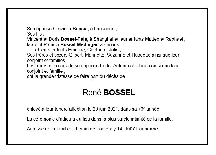 René BOSSEL 20 juin. 2021 Avis mortuaire PFG Télecharger PDF Partager sur: Galerie PreviousNext PreviousNext