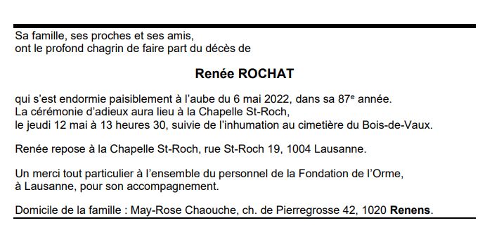 Renée ROCHAT 17 juil. 1935 - 06 mai. 2022 Avis mortuaire PFG Télecharger PDF Partager sur: Galerie PreviousNext PreviousNext