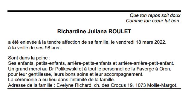 Richardine Juliana ROULET 05 avr. 1924 - 18 mar. 2022 Avis mortuaire PFG Télecharger PDF Partager sur: Galerie PreviousNext PreviousNext