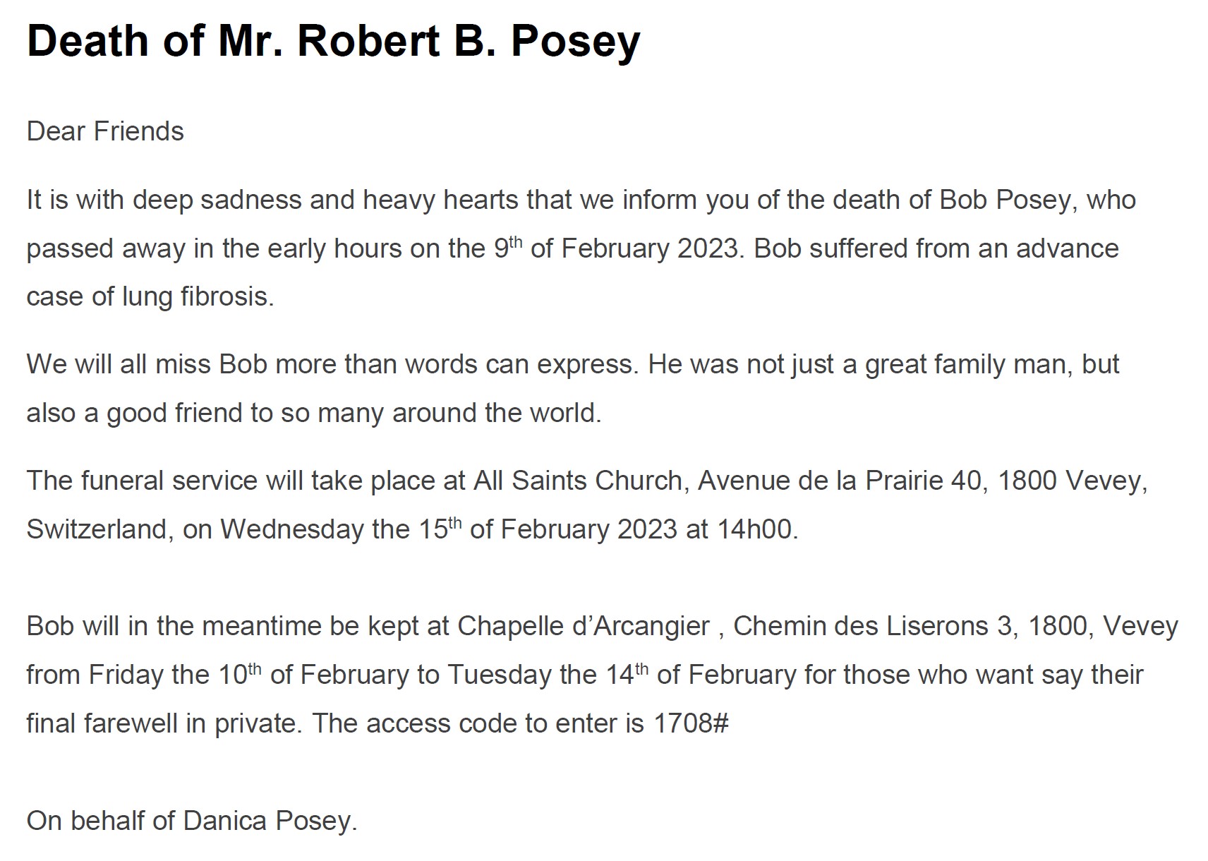 Robert B. POSEY "Bob" 09 fév. 2023 Avis mortuaire PFG Télecharger PDF Partager sur: Galerie PreviousNext PreviousNext