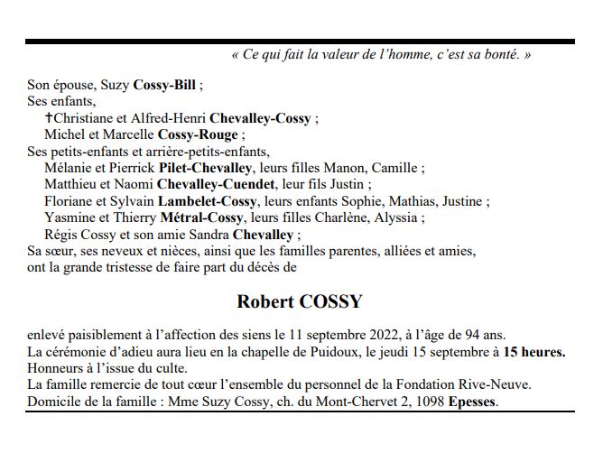 Robert COSSY 08 aoû. 1928 - 11 sep. 2022 Avis mortuaire PFG Télecharger PDF Partager sur: Galerie PreviousNext PreviousNext