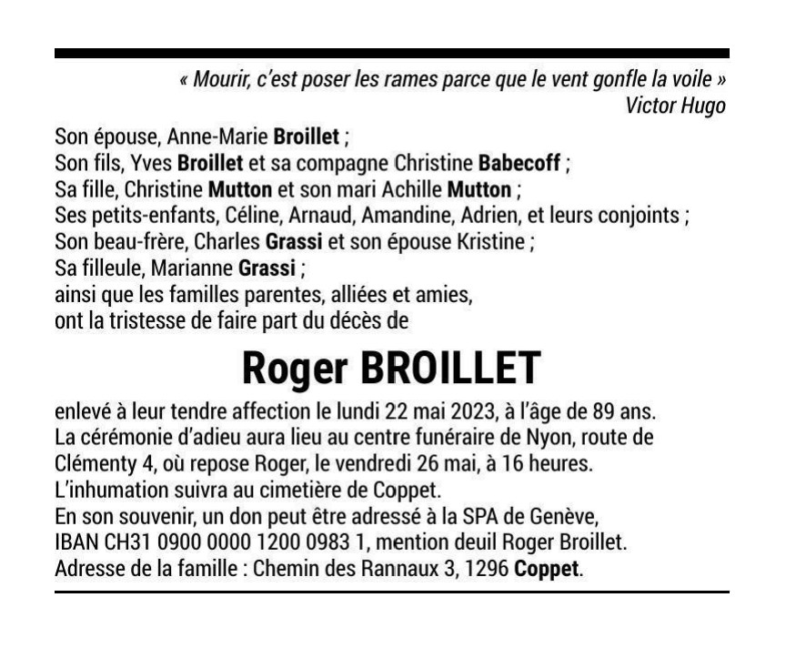 Roger BROILLET 25 juil. 1933 - 22 mai. 2023 Avis mortuaire PFG Télecharger PDF Partager sur: Galerie PreviousNext PreviousNext