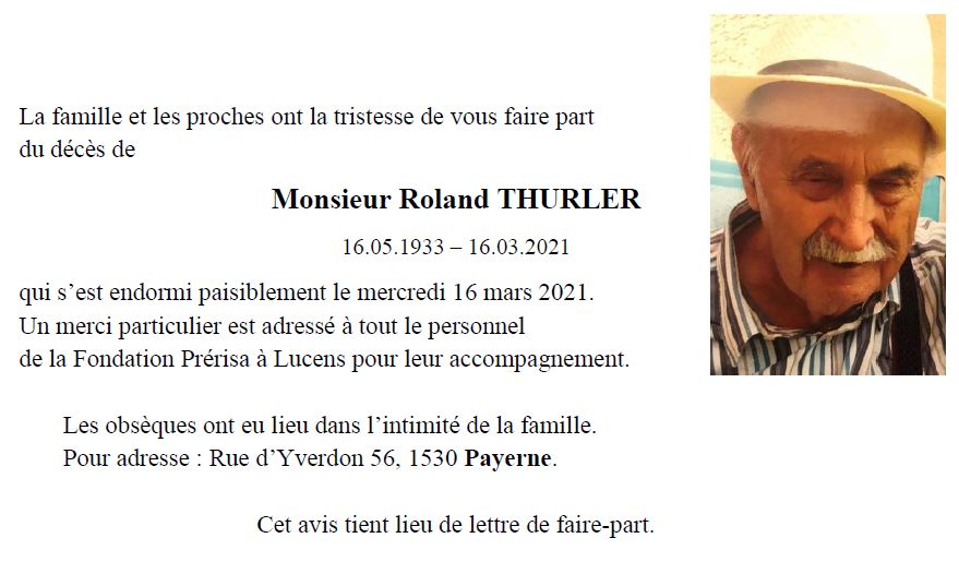 Roland THURLER 16 mai. 1933 - 16 mar. 2021 Avis mortuaire PFG Télecharger PDF Partager sur: Galerie PreviousNext PreviousNext