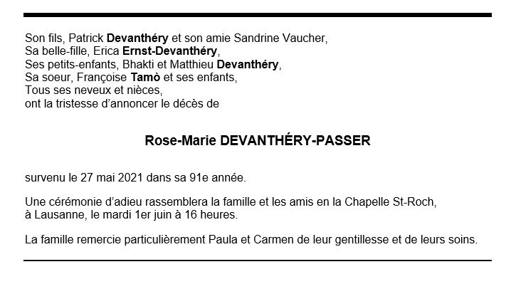 Rose-Marie DEVANTHÉRY-PASSER 16 juin. 1930 - 27 mai. 2021 Avis mortuaire PFG Télecharger PDF Partager sur: Galerie PreviousNext PreviousNext