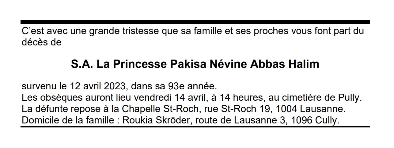 S.A. La Princesse Pakisa Névine Abbas Halim 30 juin. 1930 - 12 avr. 2023 Avis mortuaire PFG Télecharger PDF Partager sur: Galerie PreviousNext PreviousNext