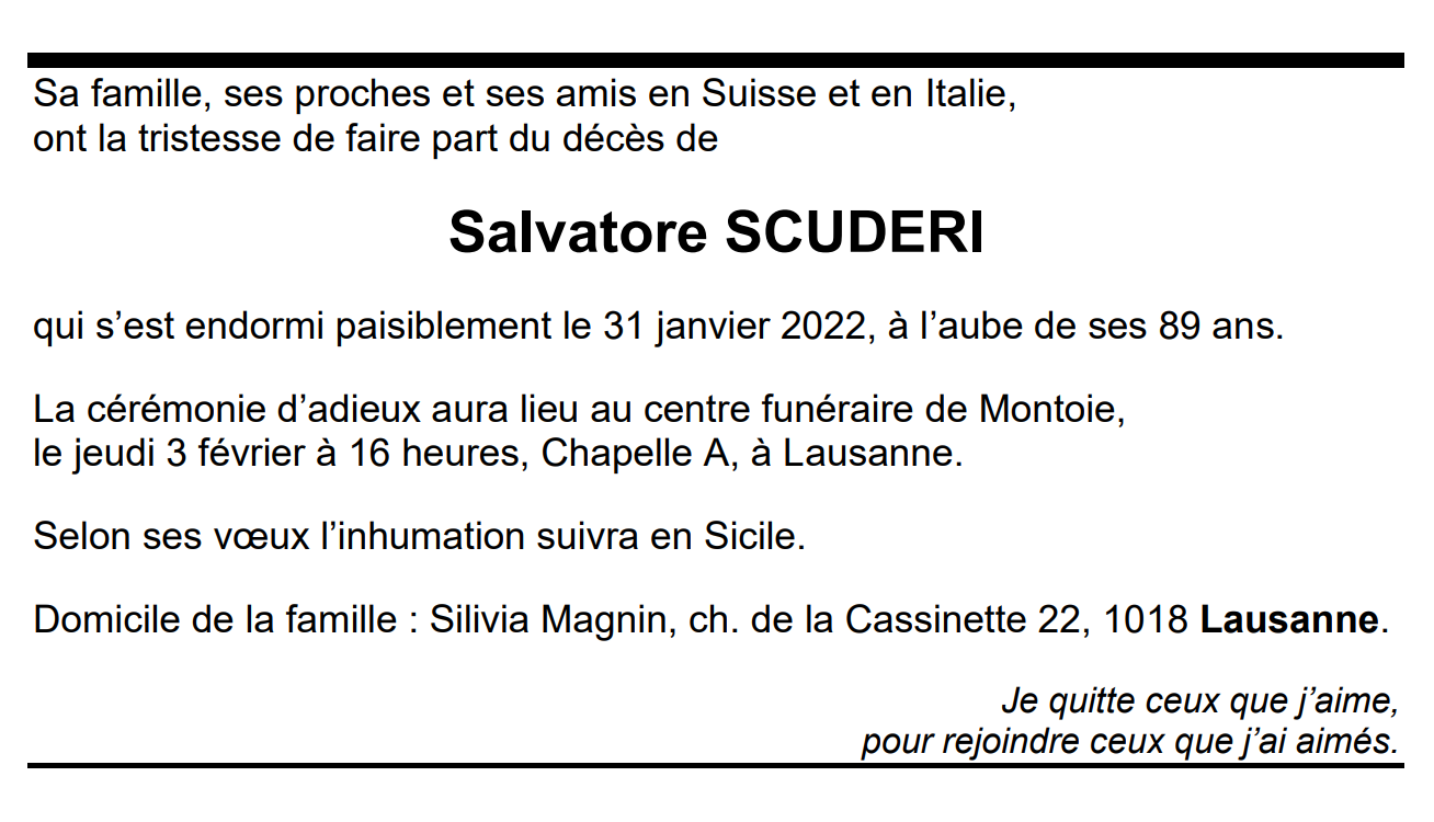 Salvatore SCUDERI 27 fév. 1933 - 31 jan. 2022 Avis mortuaire PFG Télecharger PDF Partager sur: Galerie PreviousNext PreviousNext