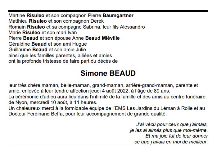 Simone BEAUD 09 jan. 1933 - 04 aoû. 2022 Avis mortuaire PFG Télecharger PDF Partager sur: Galerie PreviousNext PreviousNext