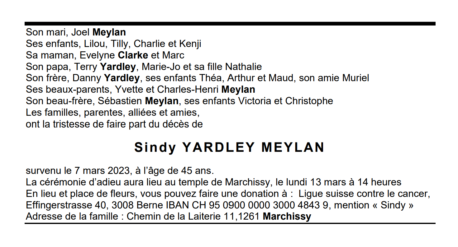Sindy YARDLEY MEYLAN 31 mai. 1977 - 07 mar. 2023 Avis mortuaire PFG Télecharger PDF Partager sur: Galerie PreviousNext PreviousNext