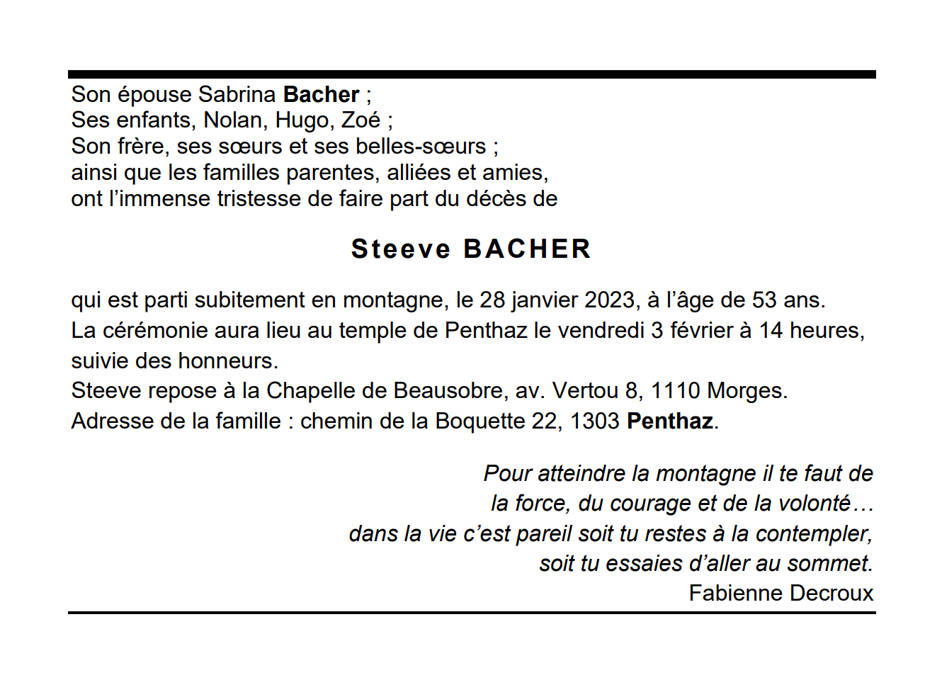 Steeve BACHER 18 déc. 1969 - 28 jan. 2023 Avis mortuaire PFG Télecharger PDF Partager sur: Galerie PreviousNext PreviousNext