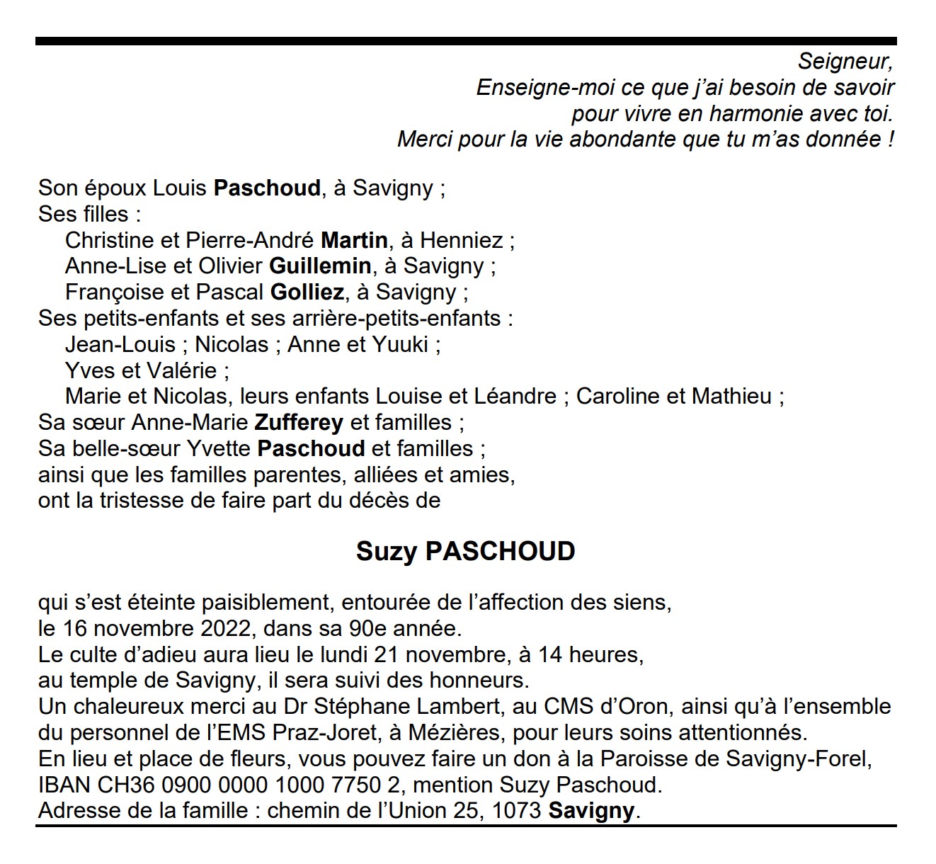 Suzy PASCHOUD 31 aoû. 1932 - 16 nov. 2022 Avis mortuaire PFG Télecharger PDF Partager sur: Galerie PreviousNext PreviousNext