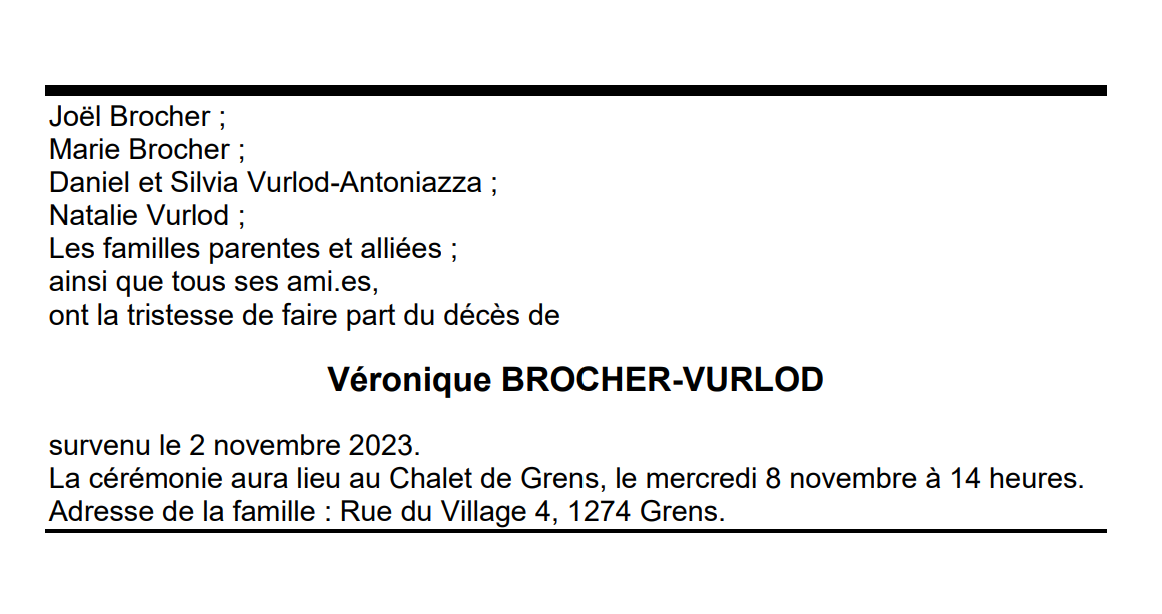 Véronique BROCHER-VURLOD 19 sep. 1963 - 02 nov. 2023 Avis mortuaire PFG Télecharger PDF Partager sur: Galerie PreviousNext PreviousNext