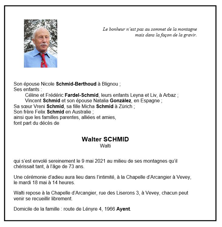 Walter SCHMID 26 jan. 1948 - 09 mai. 2021 Avis mortuaire PFG Télecharger PDF Partager sur: Galerie PreviousNext PreviousNext