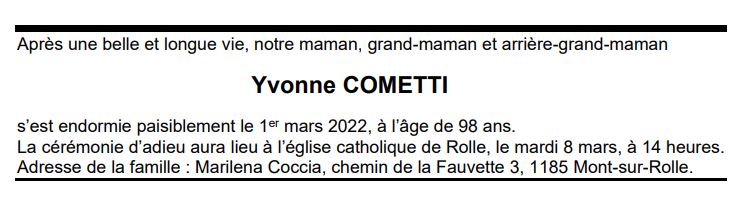 Yvonne COMETTI 21 oct. 1923 - 01 mar. 2022 Avis mortuaire PFG Télecharger PDF Partager sur: Galerie PreviousNext PreviousNext